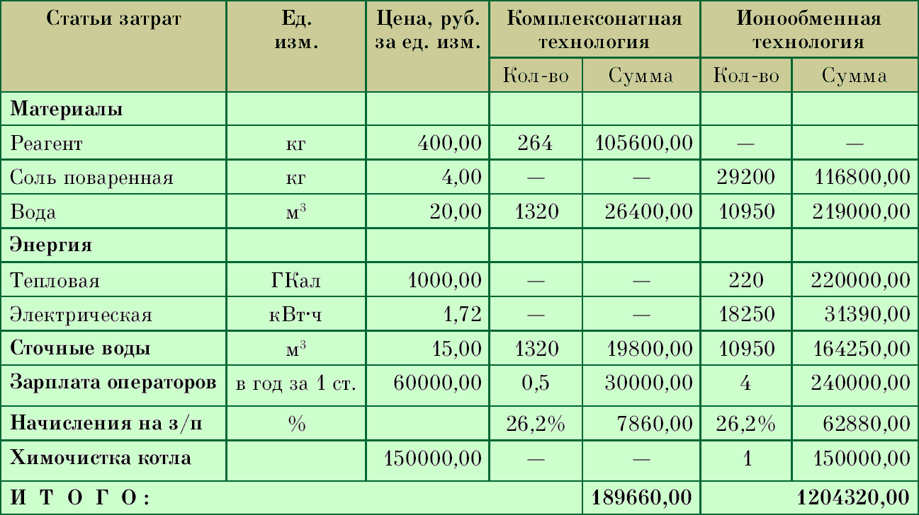 В таблице приводится сравнение затрат на обработку воды (расход 5 м3/час)
